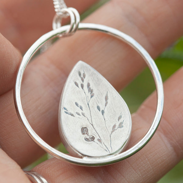 The Mae pendant features a natural stone framed in a silver circle.