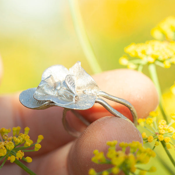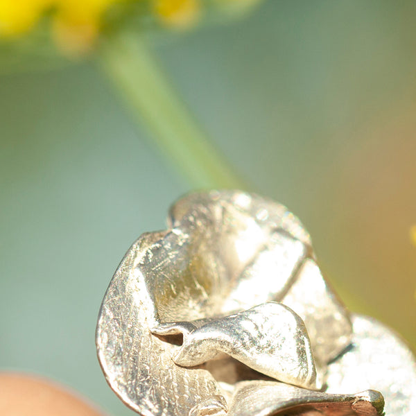 Nalae is a small series of one-of-a-kind rings, shaped through the lost-wax process. Each ring carries organic forms that reminded me of petals, shells, rocks… shapes that feel sculpted by time and nature. They have a more textured, raw presence than my usual collections ~ a bit wilder, yet with lots of softness too.
