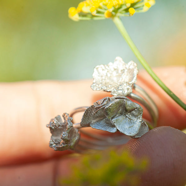 Nalae is a small series of one-of-a-kind rings, shaped through the lost-wax process. Each ring carries organic forms that reminded me of petals, shells, rocks… shapes that feel sculpted by time and nature. They have a more textured, raw presence than my usual collections ~ a bit wilder, yet with lots of softness too.