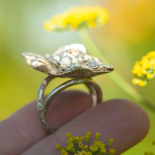 Nalae is a small series of one-of-a-kind rings, shaped through the lost-wax process. Each ring carries organic forms that reminded me of petals, shells, rocks… shapes that feel sculpted by time and nature. They have a more textured, raw presence than my usual collections ~ a bit wilder, yet with lots of softness too.